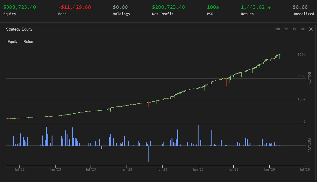The strategy was backtested on historical SPX index option data sourced from QuantConnect, assuming an initial investment of $20,000 and 30% capital at risk. Past performance, actual or simulated, can never guarantee future results in trading.